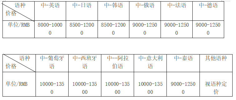 1. 不同语言,收费不同,入英译汉,汉译英,汉译日等等,收费都不同,通常越是语言使用人数少,或者学习该语言的人数较少,翻译价格越高;